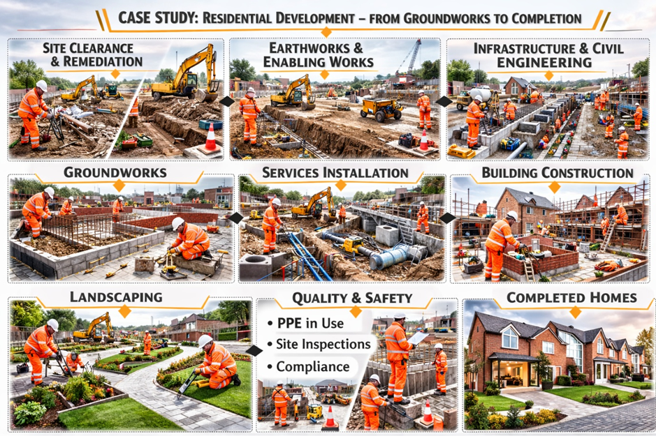 CivilTech Group successfully delivered the groundworks and foundations package up to DPC level for a residential development in Basingstoke, Hampshire. The works included excavation, concrete strip foundations, blockwork to damp proof course, installation of underground drainage and service ducts, followed by external works including kerbing, surfacing and road markings. The project was completed safely, to programme, and in full compliance with Building Control requirements, providing a high-quality substructure ready for superstructure construction.