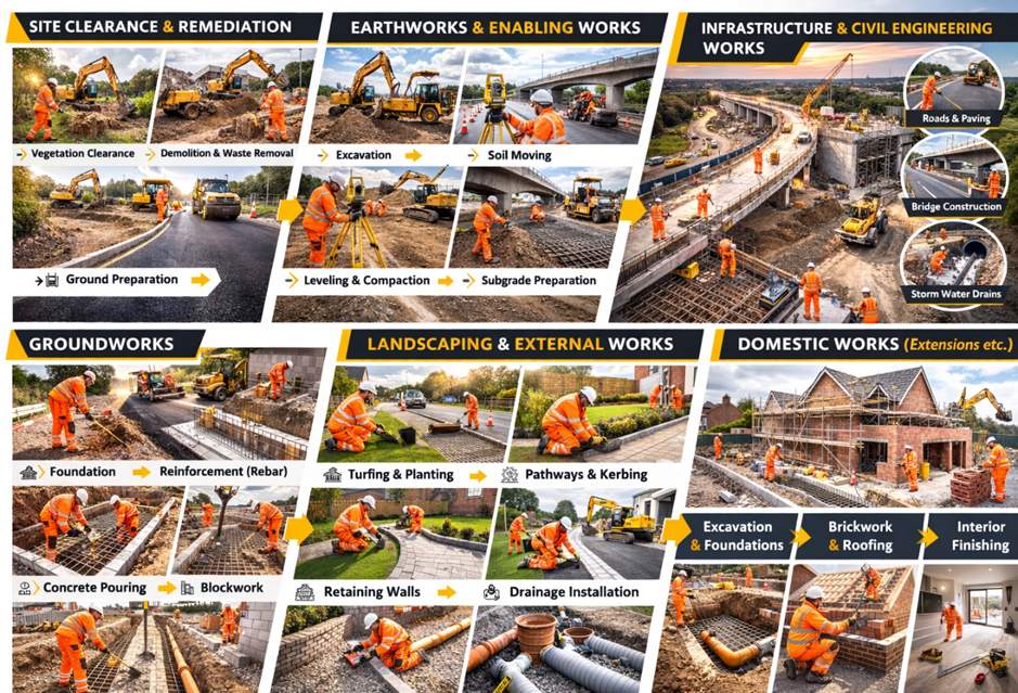 Our services also cover full groundworks packages, infrastructure and civil engineering works including drainage systems, utility installations and access roads. In addition, we deliver high-quality domestic construction services such as extensions and external works, ensuring every project meets the highest standards of safety, durability and finish.